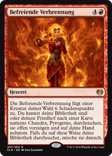 | Rules | Liberating Combustion deals 6 damage to target creature. You may search your library and/or graveyard for a card named Chandra, Pyrogenius, reveal it, and put it into your hand. If you search your library this way, shuffle. |
