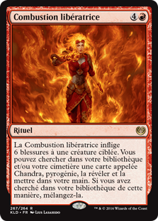 | Rules | Liberating Combustion deals 6 damage to target creature. You may search your library and/or graveyard for a card named Chandra, Pyrogenius, reveal it, and put it into your hand. If you search your library this way, shuffle. |