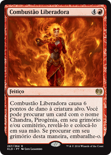 | Rules | Liberating Combustion deals 6 damage to target creature. You may search your library and/or graveyard for a card named Chandra, Pyrogenius, reveal it, and put it into your hand. If you search your library this way, shuffle. |