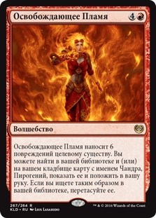 | Rules | Liberating Combustion deals 6 damage to target creature. You may search your library and/or graveyard for a card named Chandra, Pyrogenius, reveal it, and put it into your hand. If you search your library this way, shuffle. |
