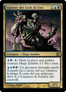 | Rules | , : Create a 1/1 blue and black Zombie Wizard creature token. : Target player loses X life and mills X cards, where X is the number of Zombies you control. |