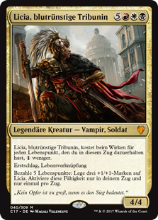 | Rules | This spell costs less to cast for each 1 life you gained this turn. First strike, lifelink Pay 5 life: Put three +1/+1 counters on Licia, Sanguine Tribune. Activate only during your turn and only once each turn. |