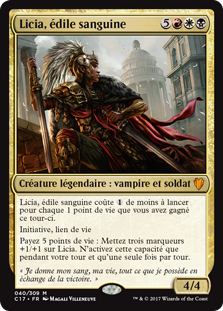 Pay 5 life: Put three +1/+1 counters on Licia, Sanguine Tribune. Activate only during your turn and only once each turn.