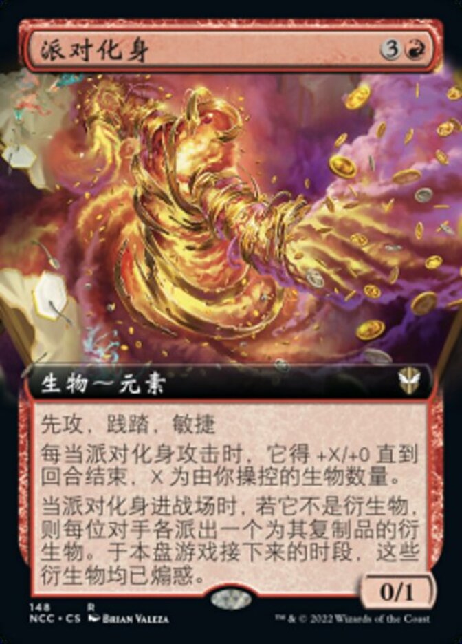 | Rules | First strike, trample, haste Whenever Life of the Party attacks, it gets +X/+0 until end of turn, where X is the number of creatures you control. When Life of the Party enters the battlefield, if it's not a token, each opponent creates a token that's a copy of it. The tokens are goaded for the rest of the game. (They attack each combat if able and attack a player other than you if able.) |