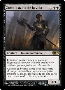| Rules | Intimidate (This creature can't be blocked except by artifact creatures and/or creatures that share a color with it.) When Lifebane Zombie enters the battlefield, target opponent reveals their hand. You choose a green or white creature card from it and exile that card. |