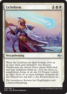 | Rules | When Lightform enters the battlefield, it becomes an Aura with enchant creature. Manifest the top card of your library and attach Lightform to it. (To manifest a card, put it onto the battlefield face down as a 2/2 creature. Turn it face up any time for its mana cost if it's a creature card.) Enchanted creature has flying and lifelink. |