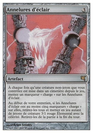 | Rules | Whenever a nontoken creature you control dies, put a charge counter on Lightning Coils. At the beginning of your upkeep, if Lightning Coils has five or more charge counters on it, remove all of them from it and create that many 3/1 red Elemental creature tokens with haste. Exile them at the beginning of the next end step. |