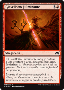 | Rules | Lightning Javelin deals 3 damage to any target. Scry 1. (Look at the top card of your library. You may put that card on the bottom of your library.) |
