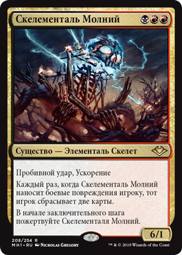 | Rules | Trample, haste Whenever Lightning Skelemental deals combat damage to a player, that player discards two cards. At the beginning of the end step, sacrifice Lightning Skelemental. |