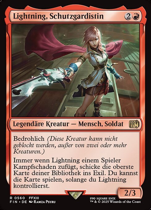 | Rules | Menace (This creature can't be blocked except by two or more creatures.) Whenever Lightning deals combat damage to a player, exile the top card of your library. You may play that card for as long as you control Lightning. |