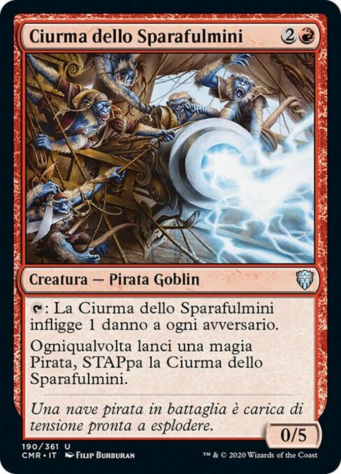 | Rules | : Lightning-Rig Crew deals 1 damage to each opponent. Whenever you cast a Pirate spell, untap Lightning-Rig Crew. |