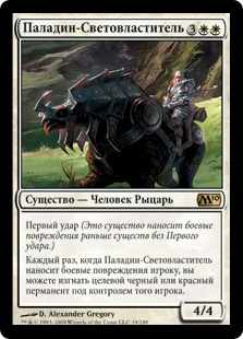 | Rules | First strike (This creature deals combat damage before creatures without first strike.) Whenever Lightwielder Paladin deals combat damage to a player, you may exile target black or red permanent that player controls. |