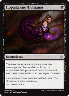 | Rules | Destroy target black creature or black planeswalker. If that permanent was a Liliana planeswalker, her controller loses 3 life. |