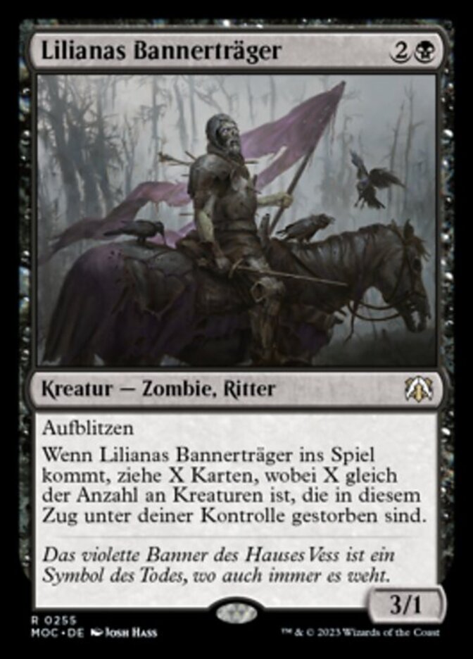 | Rules | Flash When Liliana's Standard Bearer enters the battlefield, draw X cards, where X is the number of creatures that died under your control this turn. |