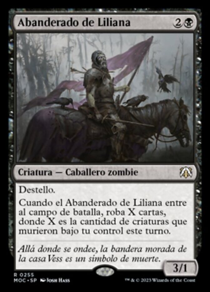 | Rules | Flash When Liliana's Standard Bearer enters the battlefield, draw X cards, where X is the number of creatures that died under your control this turn. |
