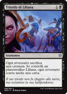 | Rules | Each opponent sacrifices a creature. If you control a Liliana planeswalker, each opponent also discards a card. |