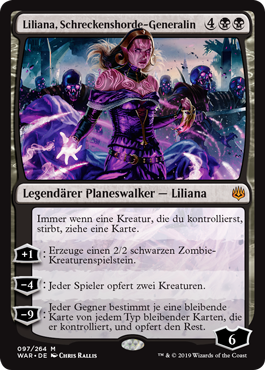| Rules | Whenever a creature you control dies, draw a card. +1: Create a 2/2 black Zombie creature token. −4: Each player sacrifices two creatures. −9: Each opponent chooses a permanent they control of each permanent type and sacrifices the rest. |
