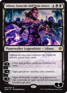 | Rules | Whenever a creature you control dies, draw a card. +1: Create a 2/2 black Zombie creature token. −4: Each player sacrifices two creatures. −9: Each opponent chooses a permanent they control of each permanent type and sacrifices the rest. |