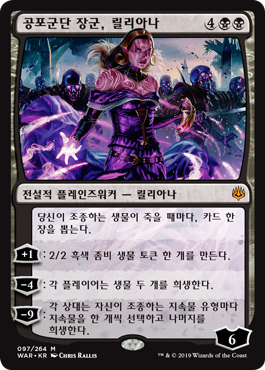 | Rules | Whenever a creature you control dies, draw a card. +1: Create a 2/2 black Zombie creature token. −4: Each player sacrifices two creatures. −9: Each opponent chooses a permanent they control of each permanent type and sacrifices the rest. |