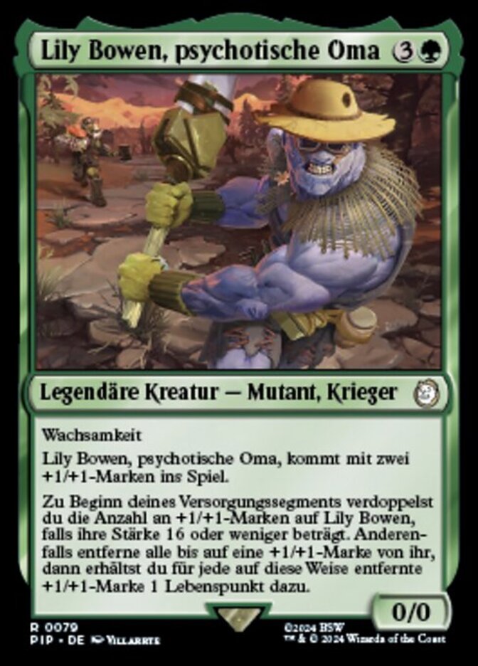 | Rules | Vigilance Lily Bowen, Raging Grandma enters the battlefield with two +1/+1 counters on it. At the beginning of your upkeep, double the number of +1/+1 counters on Lily Bowen if its power is 16 or less. Otherwise, remove all but one +1/+1 counter from it, then you gain 1 life for each +1/+1 counter removed this way. |
