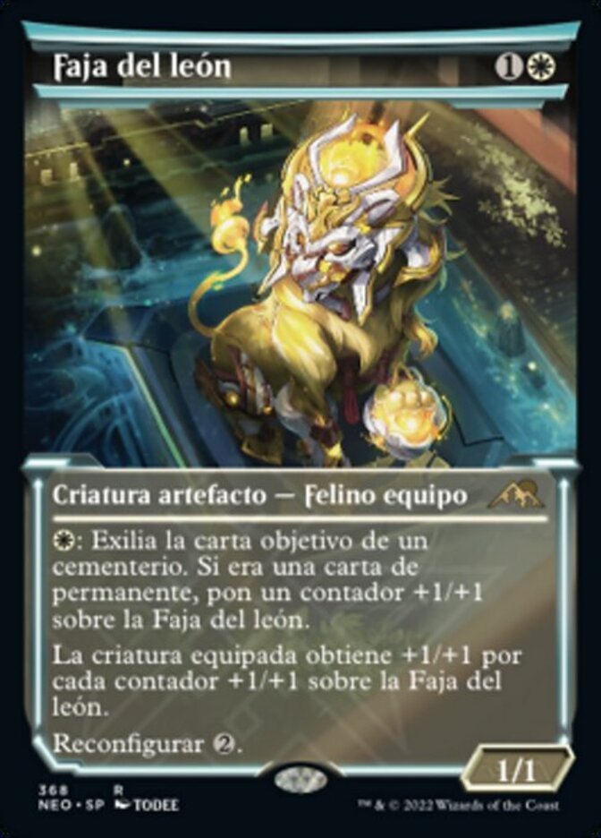 | Rules | : Exile target card from a graveyard. If it was a permanent card, put a +1/+1 counter on Lion Sash. Equipped creature gets +1/+1 for each +1/+1 counter on Lion Sash. Reconfigure (: Attach to target creature you control; or unattach from a creature. Reconfigure only as a sorcery. While attached, this isn't a creature.) |