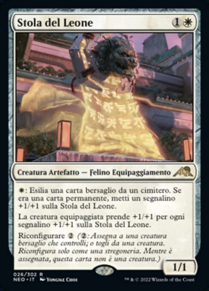 | Rules | : Exile target card from a graveyard. If it was a permanent card, put a +1/+1 counter on Lion Sash. Equipped creature gets +1/+1 for each +1/+1 counter on Lion Sash. Reconfigure (: Attach to target creature you control; or unattach from a creature. Reconfigure only as a sorcery. While attached, this isn't a creature.) |