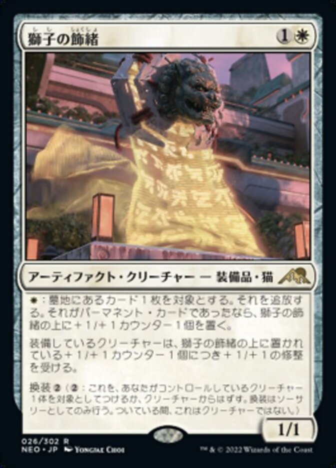 | Rules | : Exile target card from a graveyard. If it was a permanent card, put a +1/+1 counter on Lion Sash. Equipped creature gets +1/+1 for each +1/+1 counter on Lion Sash. Reconfigure (: Attach to target creature you control; or unattach from a creature. Reconfigure only as a sorcery. While attached, this isn't a creature.) |