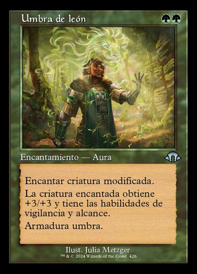 | Rules | Enchant modified creature (Equipment, Auras its controller controls, and counters are modifications.) Enchanted creature gets +3/+3 and has vigilance and reach. Umbra armor (If enchanted creature would be destroyed, instead remove all damage from it and destroy this Aura.) |