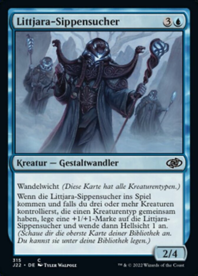 | Rules | Changeling (This card is every creature type.) When Littjara Kinseekers enters the battlefield, if you control three or more creatures that share a creature type, put a +1/+1 counter on Littjara Kinseekers, then scry 1. |