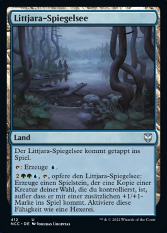 | Rules | Littjara Mirrorlake enters the battlefield tapped. : Add . , , Sacrifice Littjara Mirrorlake: Create a token that's a copy of target creature you control, except it enters the battlefield with an additional +1/+1 counter on it. Activate only as a sorcery. |