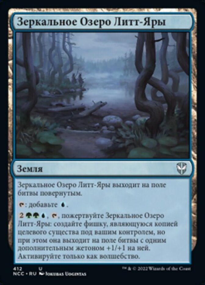 | Rules | Littjara Mirrorlake enters the battlefield tapped. : Add . , , Sacrifice Littjara Mirrorlake: Create a token that's a copy of target creature you control, except it enters the battlefield with an additional +1/+1 counter on it. Activate only as a sorcery. |
