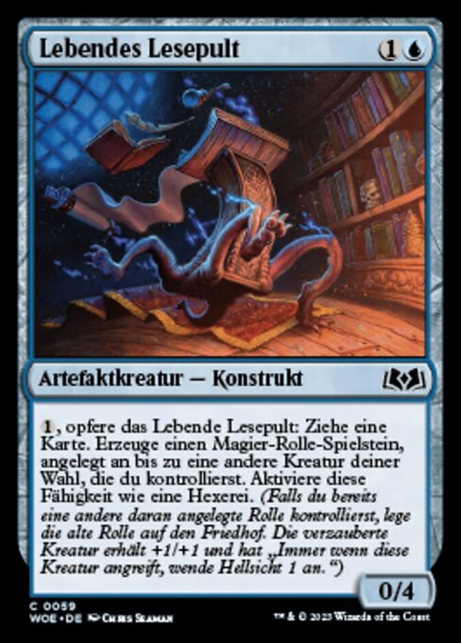 | Rules | , Sacrifice Living Lectern: Draw a card. Create a Sorcerer Role token attached to up to one other target creature you control. Activate only as a sorcery. (If you control another Role on it, put that one into the graveyard. Enchanted creature gets +1/+1 and has "Whenever this creature attacks, scry 1.") |