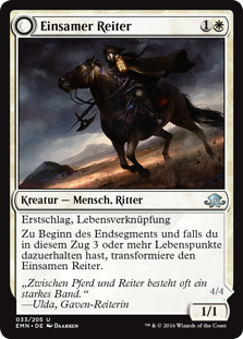 | Rules | First strike, lifelink At the beginning of the end step, if you gained 3 or more life this turn, transform Lone Rider. // First strike, trample, lifelink |