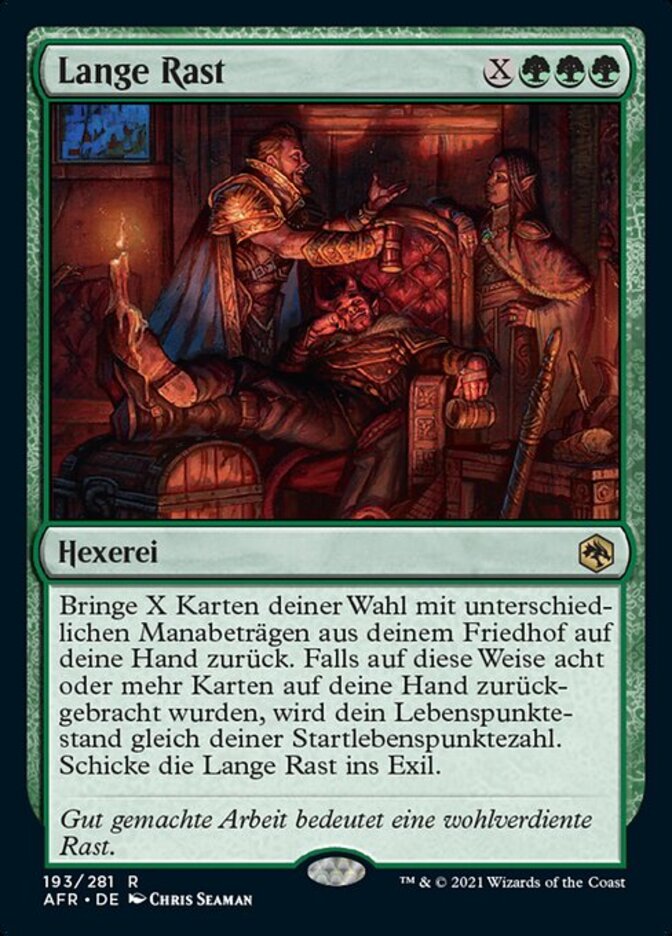 | Rules | Return X target cards with different mana values from your graveyard to your hand. If eight or more cards were returned to your hand this way, your life total becomes equal to your starting life total. Exile Long Rest. |