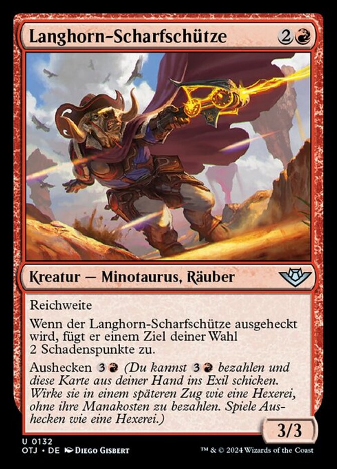 | Rules | Reach When Longhorn Sharpshooter becomes plotted, it deals 2 damage to any target. Plot (You may pay and exile this card from your hand. Cast it as a sorcery on a later turn without paying its mana cost. Plot only as a sorcery.) |