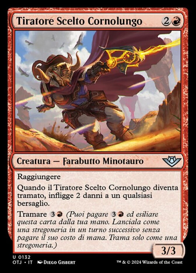 | Rules | Reach When Longhorn Sharpshooter becomes plotted, it deals 2 damage to any target. Plot (You may pay and exile this card from your hand. Cast it as a sorcery on a later turn without paying its mana cost. Plot only as a sorcery.) |