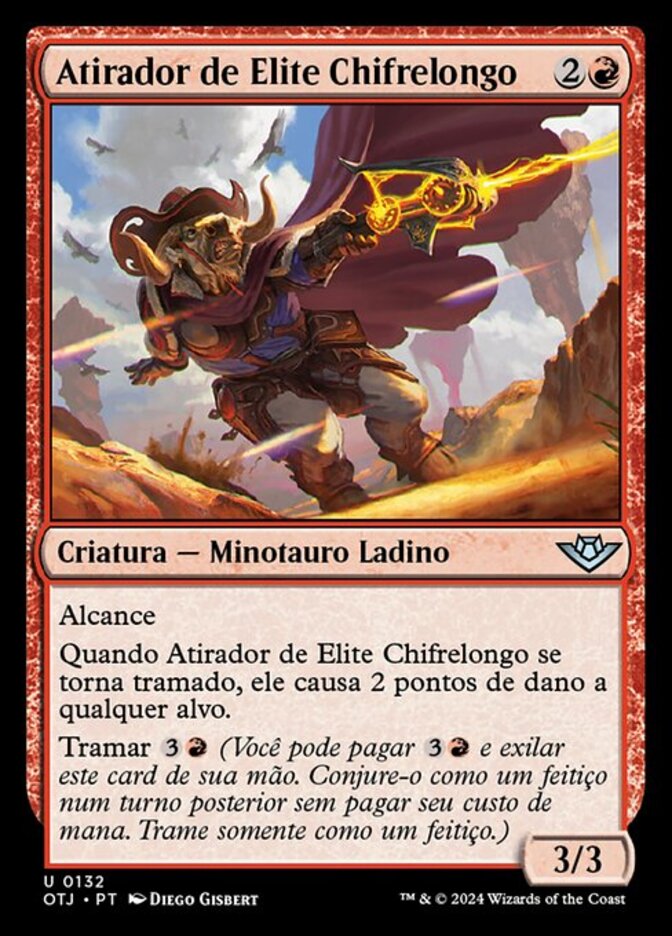 | Rules | Reach When Longhorn Sharpshooter becomes plotted, it deals 2 damage to any target. Plot (You may pay and exile this card from your hand. Cast it as a sorcery on a later turn without paying its mana cost. Plot only as a sorcery.) |