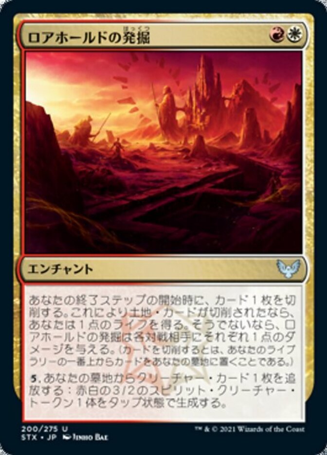 | Rules | At the beginning of your end step, mill a card. If a land card was milled this way, you gain 1 life. Otherwise, Lorehold Excavation deals 1 damage to each opponent. (To mill a card, put the top card of your library into your graveyard.) , Exile a creature card from your graveyard: Create a tapped 3/2 red and white Spirit creature token. |