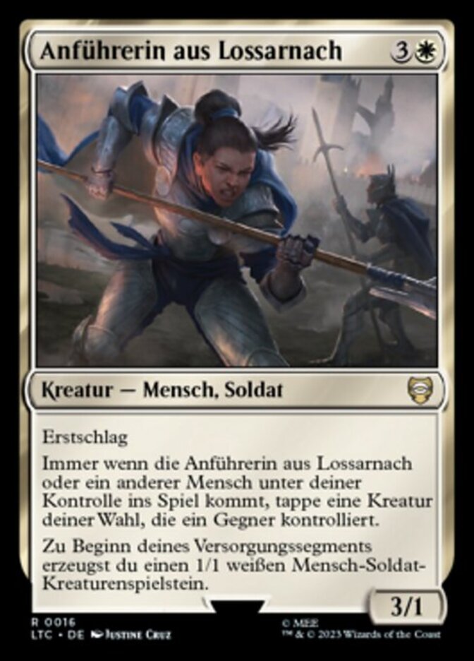 | Rules | First strike Whenever Lossarnach Captain or another Human enters the battlefield under your control, tap target creature an opponent controls. At the beginning of your upkeep, create a 1/1 white Human Soldier creature token. |