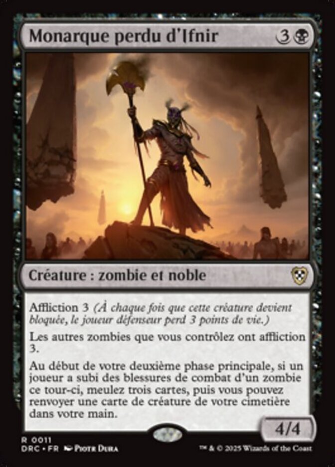 | Rules | Afflict 3 (Whenever this creature becomes blocked, defending player loses 3 life.) Other Zombies you control have afflict 3. At the beginning of your second main phase, if a player was dealt combat damage by a Zombie this turn, mill three cards, then you may return a creature card from your graveyard to your hand. |