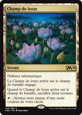 | Rules | Hexproof Lotus Field enters the battlefield tapped. When Lotus Field enters the battlefield, sacrifice two lands. : Add three mana of any one color. |