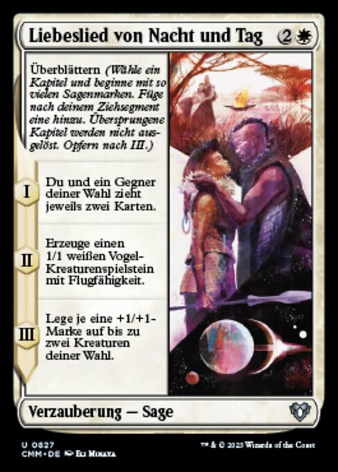 | Rules | Read ahead (Choose a chapter and start with that many lore counters. Add one after your draw step. Skipped chapters don't trigger. Sacrifice after III.) I — You and target opponent each draw two cards. II — Create a 1/1 white Bird creature token with flying. III — Put a +1/+1 counter on each of up to two target creatures. |