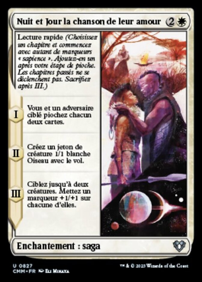 | Rules | Read ahead (Choose a chapter and start with that many lore counters. Add one after your draw step. Skipped chapters don't trigger. Sacrifice after III.) I — You and target opponent each draw two cards. II — Create a 1/1 white Bird creature token with flying. III — Put a +1/+1 counter on each of up to two target creatures. |