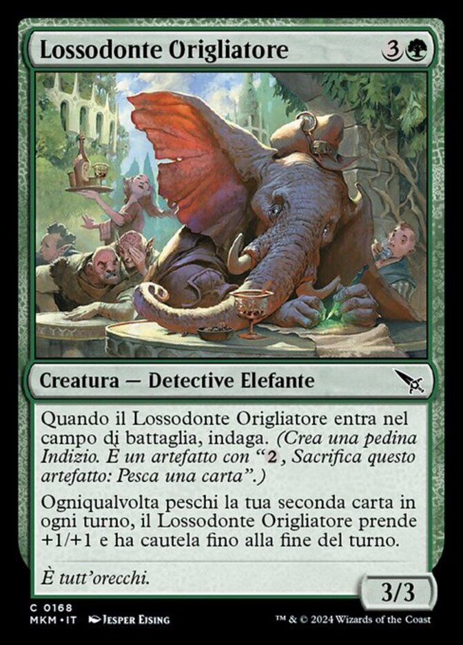 | Rules | When Loxodon Eavesdropper enters the battlefield, investigate. (Create a Clue token. It's an artifact with ", Sacrifice this artifact: Draw a card.") Whenever you draw your second card each turn, Loxodon Eavesdropper gets +1/+1 and gains vigilance until end of turn. |