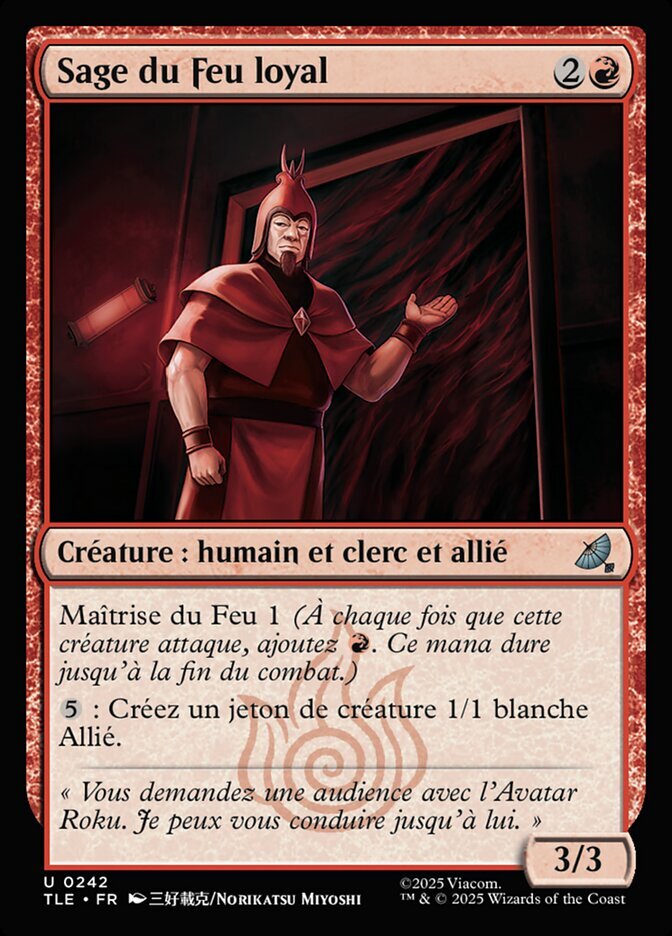 | Rules | Firebending 1 (Whenever this creature attacks, add . This mana lasts until end of combat.) : Create a 1/1 white Ally creature token. |