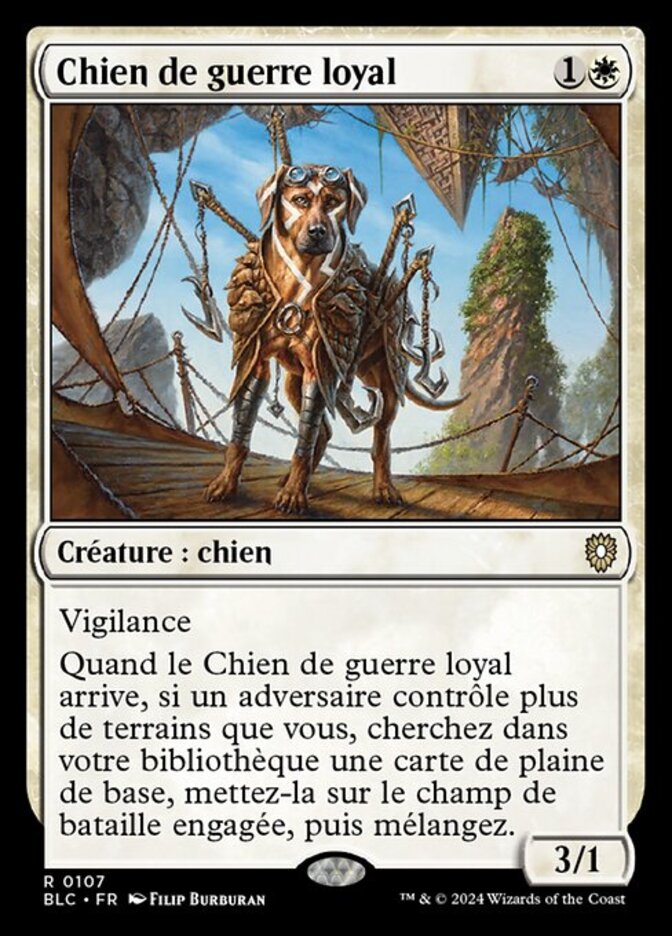 | Rules | Vigilance When Loyal Warhound enters the battlefield, if an opponent controls more lands than you, search your library for a basic Plains card, put it onto the battlefield tapped, then shuffle. |