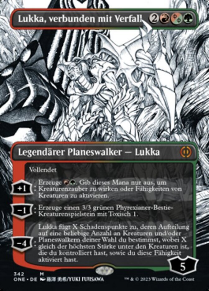 | Rules | Compleated ( can be paid with , , or 2 life. If life was paid, this planeswalker enters with two fewer loyalty counters.) +1: Add . Spend this mana only to cast creature spells or activate abilities of creatures. −1: Create a 3/3 green Phyrexian Beast creature token with toxic 1. −4: Lukka deals X damage divided as you choose among any number of target creatures and/or planeswalkers, where X is the greatest power among creatures you controlled as you activated this ability. |