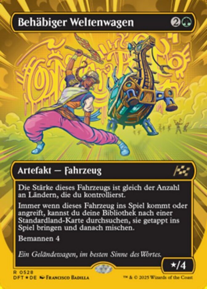 | Rules | This Vehicle's power is equal to the number of lands you control. Whenever this Vehicle enters or attacks, you may search your library for a basic land card, put it onto the battlefield tapped, then shuffle. Crew 4 |