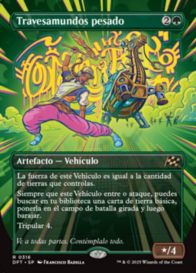 | Rules | This Vehicle's power is equal to the number of lands you control. Whenever this Vehicle enters or attacks, you may search your library for a basic land card, put it onto the battlefield tapped, then shuffle. Crew 4 |