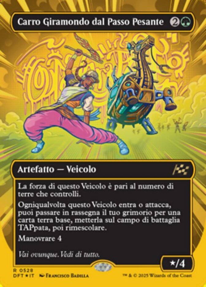 | Rules | This Vehicle's power is equal to the number of lands you control. Whenever this Vehicle enters or attacks, you may search your library for a basic land card, put it onto the battlefield tapped, then shuffle. Crew 4 |